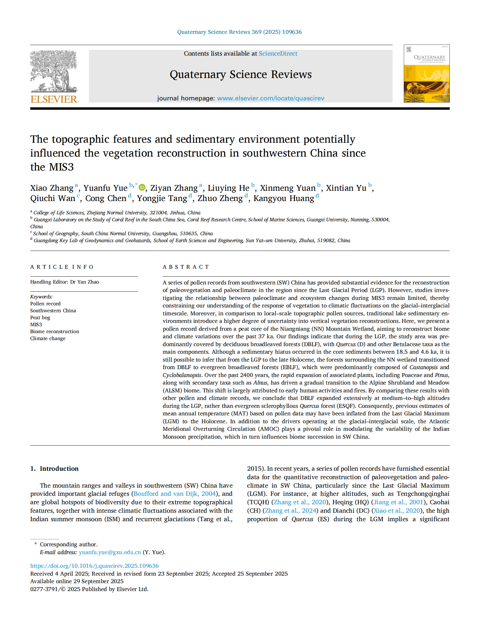 文章信息如下:Zhang, X., Yue, Y.*, Zhang, Z., He, L., Yuan, X., Yu, X., Wan, Q., Chen, C., Tang, Y., Zheng, Z., Huang, K., 2025. The topographic features and sedimentary environment potentially influenced the vegetation reconstruction in southwestern China since the MIS3. Quaternary Science Reviews 369, 109636, doi: https://doi.org/10.1016/j.quascirev.2025.109636.