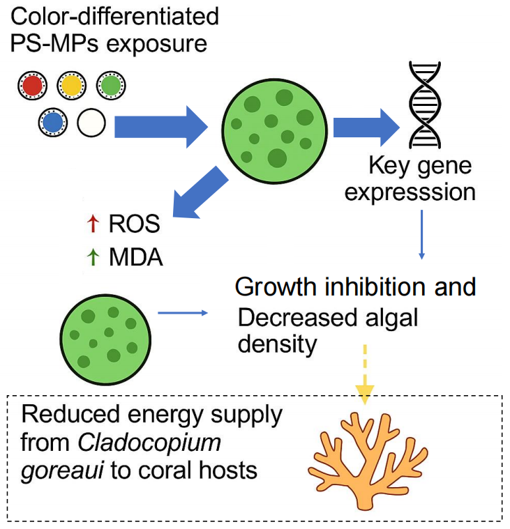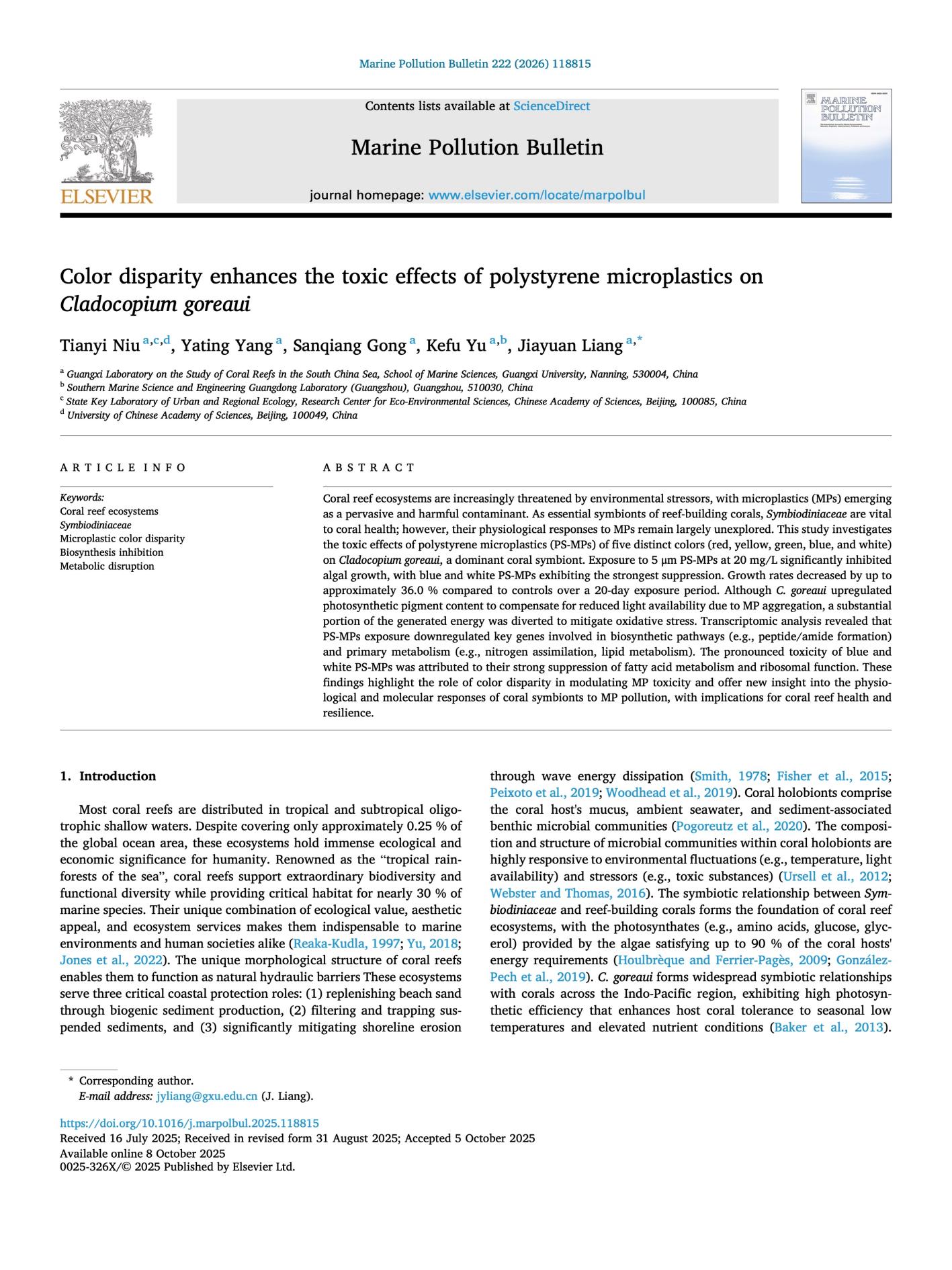 近日,实验室海洋生物与生态教研室梁甲元副教授作为通讯作者、其指导的硕士研究生牛天祎为第一作者的研究论文《Color disparity enhances the toxic effects of polystyrene microplastics on Cladocopium goreaui》在国际知名环境类期刊《Marine Pollution Bulletin》(JCR Q1,中国科学院二区)上发表。该研究聚焦微塑料污染对珊瑚礁生态系统的潜在影响,揭示了不同颜色聚苯乙烯微塑料(PS-MPs)对珊瑚共生虫黄藻的毒性差异及其生理与分子机制。