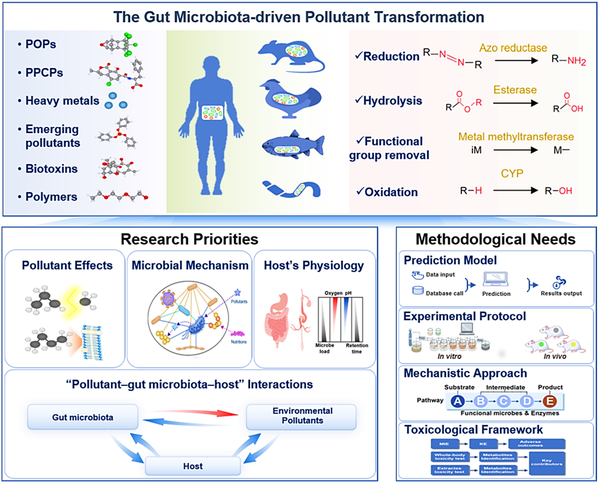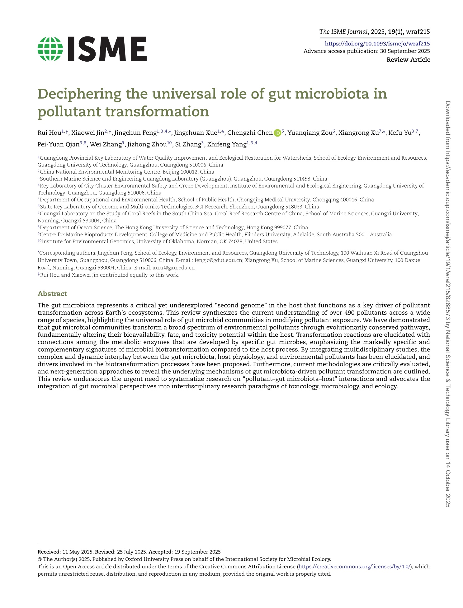 近日,实验室携手广东工业大学、中国环境监测总站,在国际微生物生态学领域顶级期刊The ISME Journal(中国科学院一区Top)联合发表评论性综述论文 “Deciphering the Universal Role of Gut Microbiota in Pollutant Transformation(解读肠道微生物在污染物转化中的普遍作用)”。该综述开创性地以“同一个星球,同一个健康(One Planet, One Health)”为研究视角,对涵盖无脊椎动物至人类的13个类群生物的肠道微生物群对490多种环境污染物的转化能力。所涉及的污染物类型广泛,包括持久性有机污染物、重金属、药品和个人护理品、工业添加剂等。此外,论文还明确揭示了肠道微生物群在污染物转化过程中的普遍作用机制,深入探讨了该转化过程对污染物生物利用度、毒性水平及环境归趋的影响。在此基础上,研究团队进一步提出“污染物—肠道微生物群—宿主”相互作用的系统化研究方向,并倡导将肠道微生物的转化能力纳入跨学科研究范式,为相关领域研究提供全新思路。