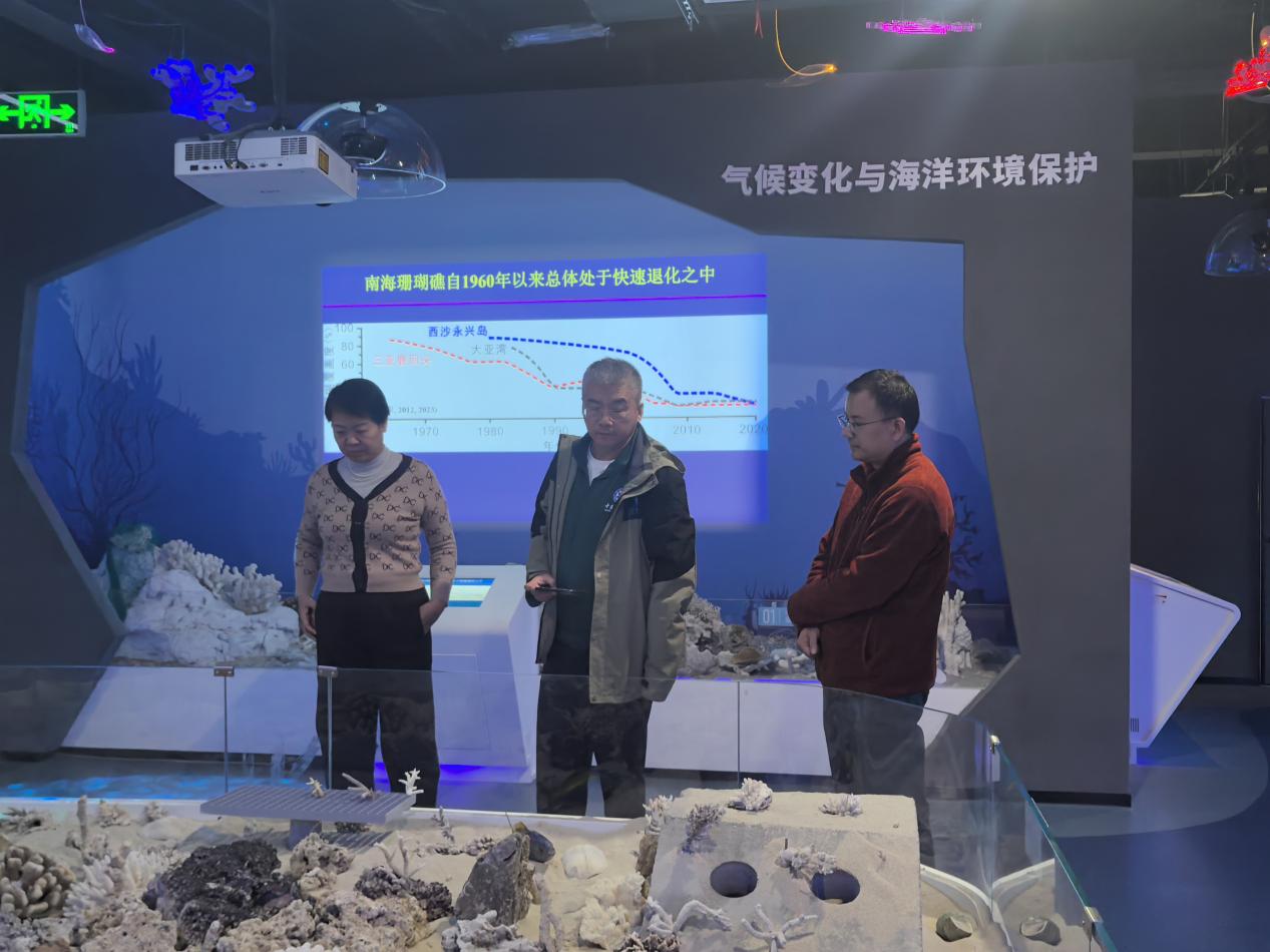 科教馆常务副馆长李周佳向张劲硕系统介绍海洋科教馆定位、场馆建设与运营状况,汇报了场馆作为集海洋学科展示、科研成果转化、科普教育传播于一体的综合性平台,在广西大学人才培养、教学实践及面向社会公众传播海洋知识、深化校地交流方面的情况。张劲硕询问了珊瑚标本的采集背景、珊瑚培育技术及科研价值,对场馆将科研成果与科普展示深度融合的做法给予高度评价。