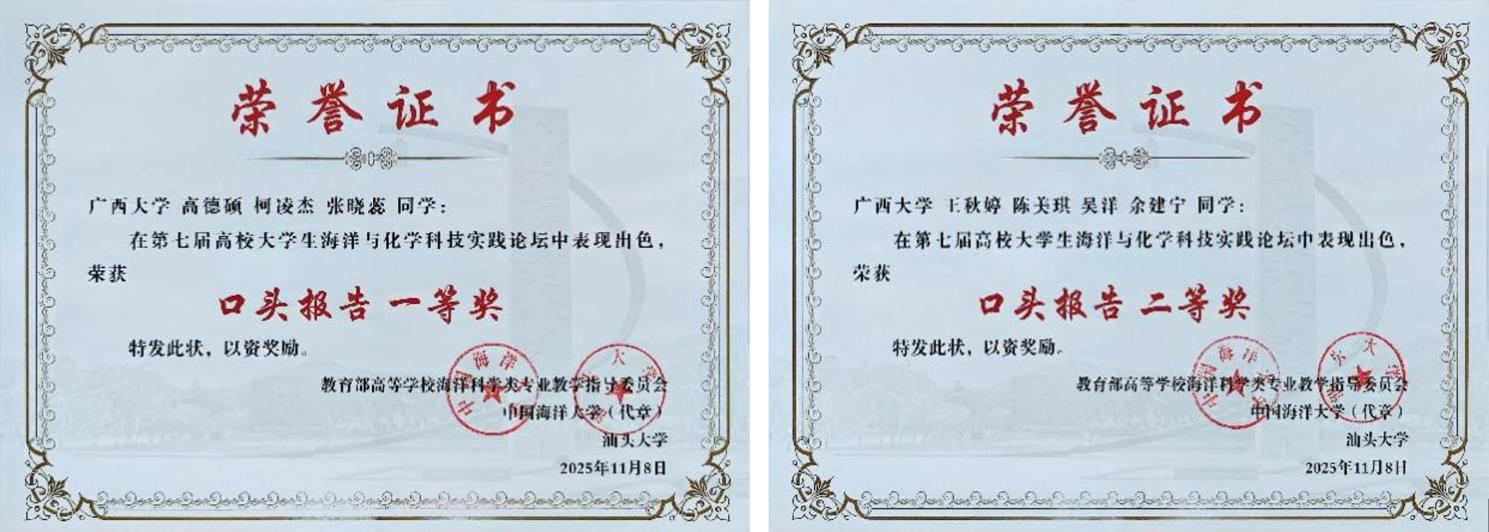 实验室学子在本次论坛中表现优异,2023级海洋科学专业本科生高德硕、王秋婷分别代表其团队作口头报告,其研究成果“基于3D打印-SPME牙签喷雾质谱快速检测复杂基质中的有机紫外吸收剂”和“珊瑚砂和珊瑚骨骼中黑碳赋存特点及其碳封存意义”,聚焦海洋环境检测技术创新与珊瑚礁碳循环等前沿领域,分别斩获一等奖、二等奖。2022级海洋科学专业本科生张佳宇的《基于质谱非靶代谢组学研究BP-3对珊瑚的毒理效应》、2024级本科生蔡晓莉的《海上石油污染对发泡聚苯乙烯泡沫和聚乙烯膜塑料中添加剂释放的影响及作用机制研究》,以展板报告形式呈现,围绕海洋生态保护与污染治理关键问题展开深入探究,获得与会专家的关注与认可。