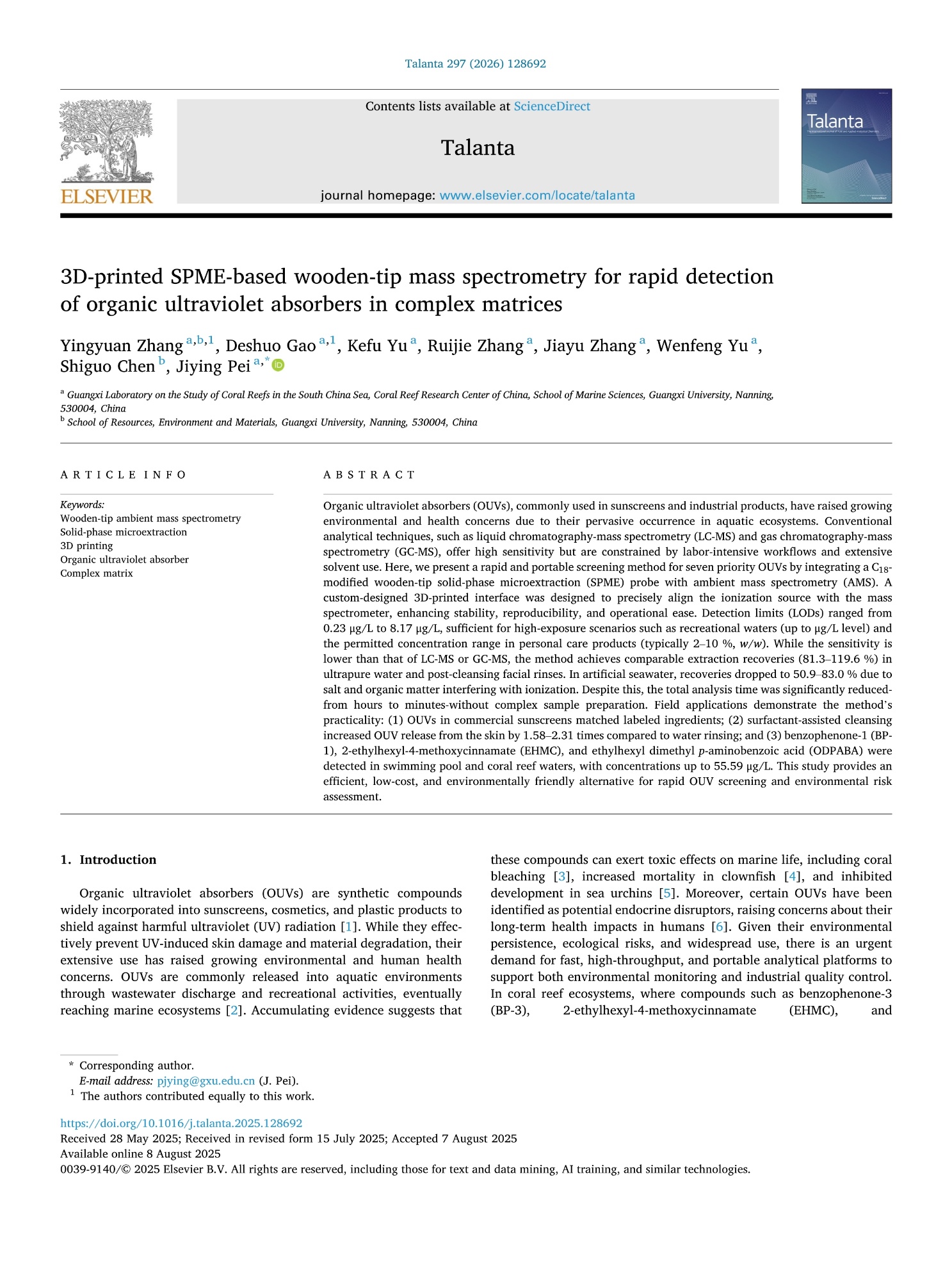Yingyuan Zhang, Deshuo Gao, Kefu Yu, Ruijie Zhang, Jiayu Zhang, Wenfeng Yu, Shiguo Chen, Jiying Pei. (2026) 3D-printed SPME-based wooden-tip mass spectrometry for rapid detection of organic ultraviolet absorbers in complex matrices. Talanta, 297: 128692. https://doi.org/10.1016/j.talanta.2025.128692.