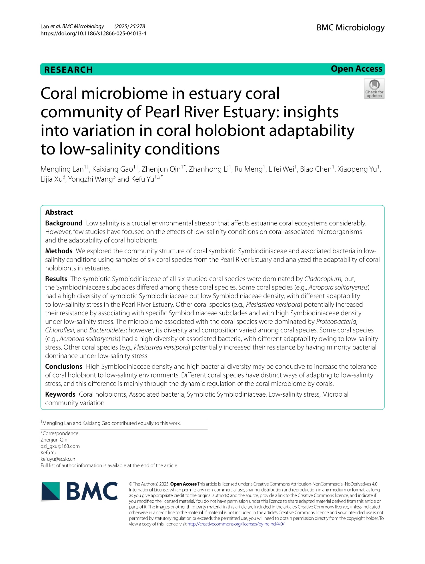 Lan Mengling, Gao Kaixiang, Qin Zhenjun, Li Zhanhong, Meng Ru, Wei Lifei, Chen Biao, Yu Xiaopeng, Xu Lijia, Wang Yongzhi, Yu Kefu. Coral microbiome in estuary coral community of Pearl River Estuary: insights into variation in coral holobiont adaptability to low-salinity conditions. BMC Microbiology, 2025, 25:278.