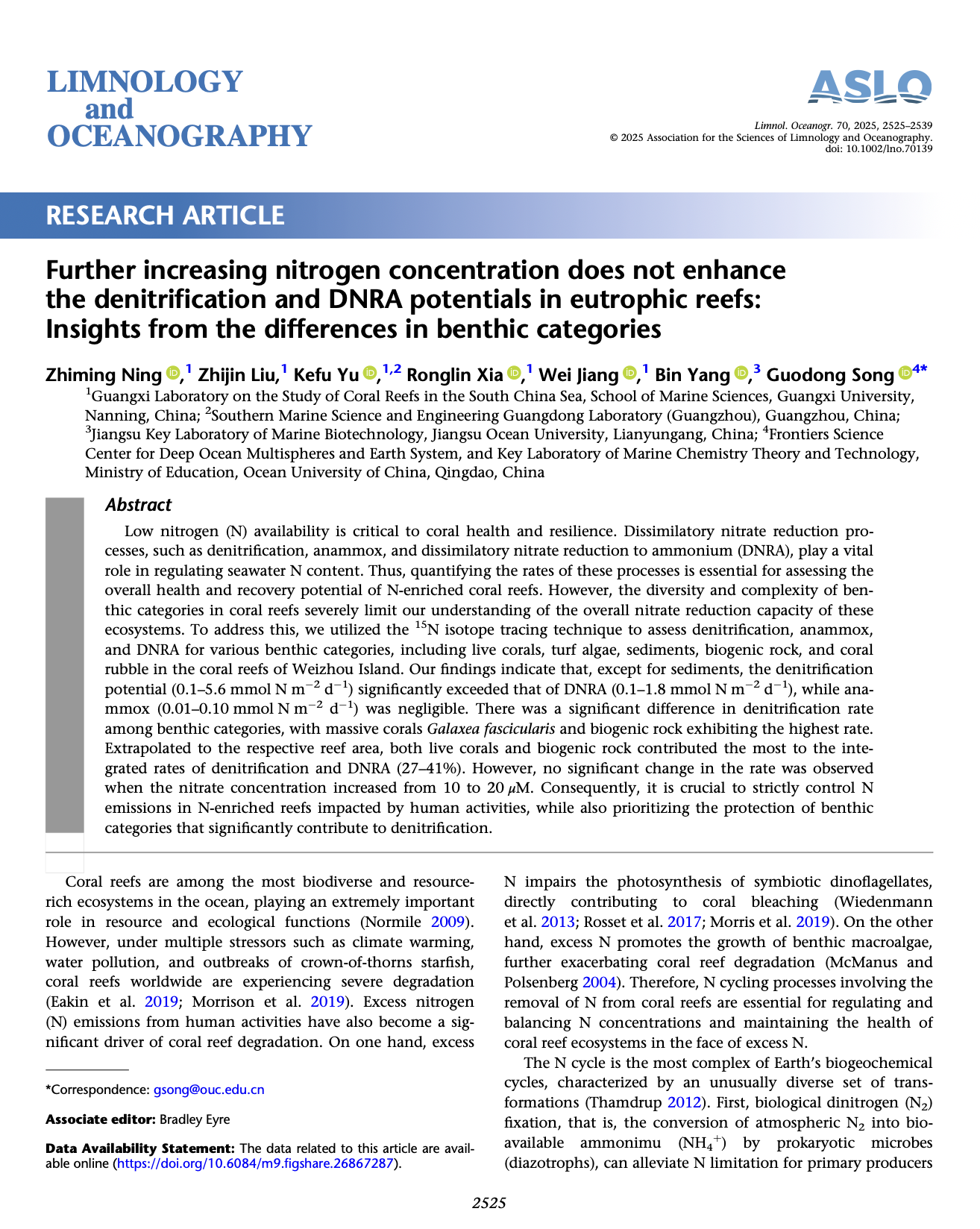 实验室宁志铭博士等在海洋学领域顶级期刊《Limnology and Oceanography》上发表了题为《Further increasing nitrogen concentration does not enhance the denitrification and DNRA potentials in eutrophic reefs: Insights from the differences in benthic categories》的研究论文。该研究系统量化了富氮珊瑚礁环境中硝酸盐异化还原过程的速率,揭示了不同底质类型与环境因子对硝酸盐异化还原过程的影响,为珊瑚礁生态系统的健康评估和应对富营养化威胁提供了关键科学依据。